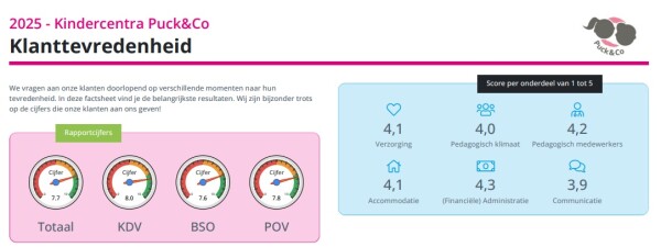 Wij waarderen de mening van onze ouders enorm, omdat deze ons helpt te groeien en te verbeteren. Om de tevredenheid van ouders te meten maken wij op verschillende momenten gebruik van de “VerbeterMeter”. De VerbeterMeter laat ons zien hoe we presteren vergeleken met andere kinderopvangorganisaties en geeft ons inzicht in de ervaringen van ouders tijdens verschillende fases van de opvang. Jouw feedback is essentieel om onze service steeds weer beter te maken.